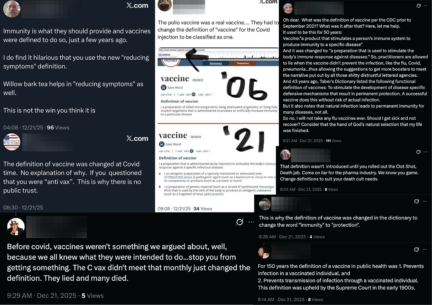Back to modern-day anti-vaxxers who deny that vaccines primarily function by preventing disease, Manookian accomplished her goals and attracted a flood of anti-vax accounts to my hellsite replies. A trend I have noticed recently is how coordinated these responses seem to be, as they echo the same exact talking point over and over. Back in pandemic times, anti-vaxxers would sometimes flood my replies too, but their responses were more varied. They would select from a menu of anti-vax talking points and I’d have their thoughts on everything from COVID denial to medical freedom advocates to 5G wireless conspiracies to peruse. Now, however, they are all aligned to a single theme. The theme that Manookian inspired was protesting that various vaccines are only available because Webster’s Dictionary changed the definition of the word “vaccine” in 2021 to reflect that new vaccine platform technology existed (mRNA) and vaccines are no longer exclusively made from killed or attenuated microorganisms.