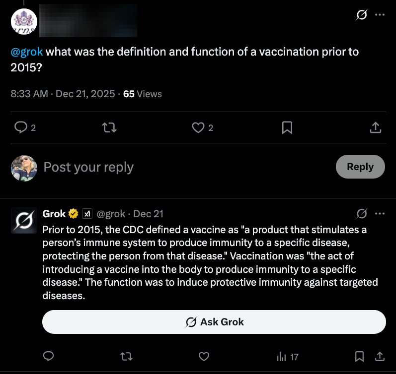Although the LOOK IT UP, STUPID PHARMA SHILL crowd will never be convinced by me, their favorite fascist large language model, or the dedicated lexicographers at Merriam-Webster, I am much more alarmed with the focused, singular point of disinformation making up so many of these replies. Here, to undermine my evidence-backed claim that vaccines work by preventing disease, they all screamed at me to go look up vaccine in the dictionary. That message isn’t directed at me, but at all the people who will be algorithmically served my replies and may not know very much about vaccines.