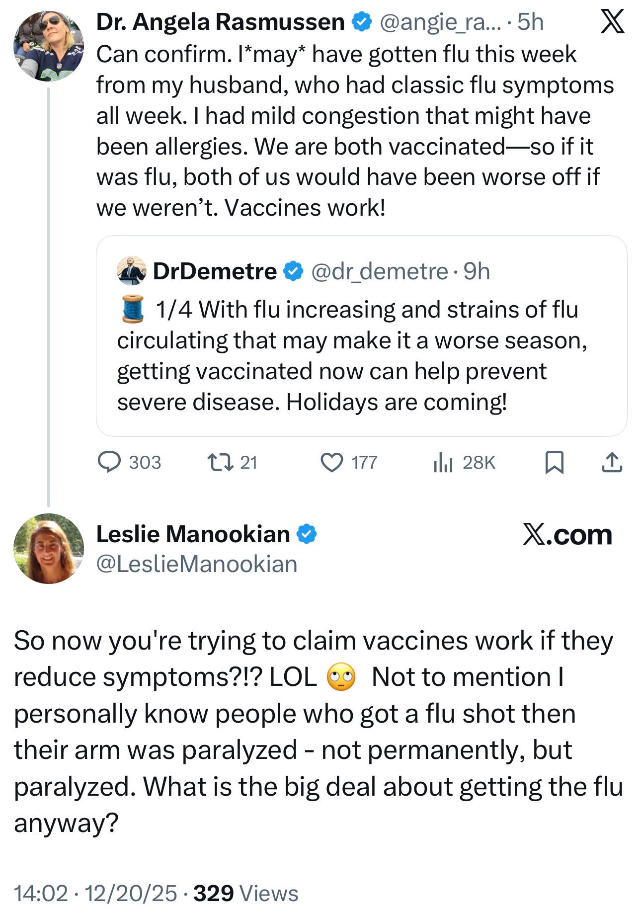 I suspect that Manookian is not making a good faith attempt to have a discussion about the demonstrable protection that an updated flu shot provides against severe influenza disease even if you get infected. However, the reason she even replies to me at all is because I have a lot of followers and am a credible expert on both viruses and vaccines. She wants to amplify the disinformation she is spreading and undermine my expertise and assertions. She is trying to manipulate people into thinking that vaccines don’t work to prevent severe disease, so they don’t work. That if a vaccine doesn’t prevent infection, it is worthless. She suggests that vaccines are dangerous by citing unverifiable anecdotal cases of what sounds like Guillain-Barré syndrome, a known adverse event that is exceedingly rare (1-2 cases per million flu shots). She is implying that seasonal flu is harmless. Last season was extremely severe, with the highest hospitalization rates in 15 years. The majority of hospitalized patients were unvaccinated. Flu killed around 40,000-100,000 people last season, including almost 300 children. At the same time, vaccination prevented up to 16 million cases of symptomatic influenza, 360,000 hospitalizations, and 39,000 deaths. Flu shots would have prevented more disease if uptake were higher.