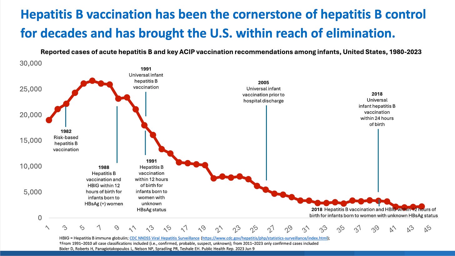 These results have been replicated everywhere that the vaccine has been deployed. After universal infant HBV vaccination began, HBV cases declined precipitously. When ACIP recommended HBV vaccination within 24 hours of birth, the already low number of cases dropped to the verge of eliminating it from the US. This vaccine works really well.