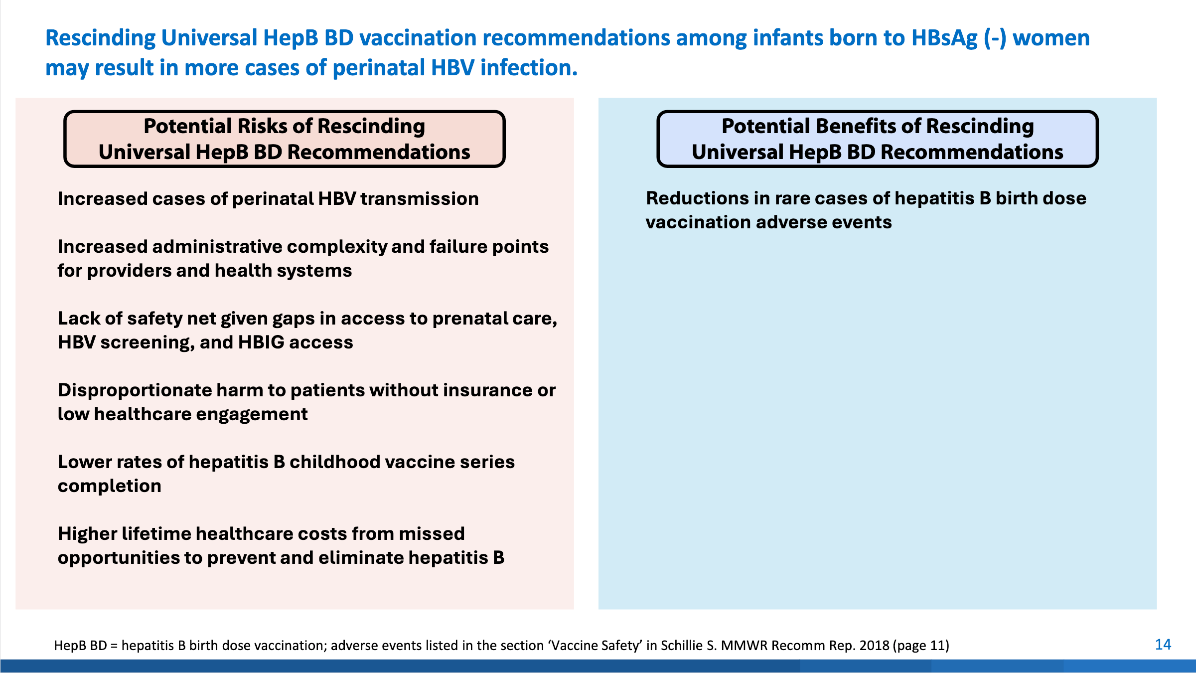 You wouldn’t. The CDC scientists put together a list of risks and benefits of rescinding the universal newborn HBV vaccination recommendation. The risks include huge increases in HBV cases, lower vaccination rates, and massive increases in costs of care from all those cancer and liver failure cases that will inevitably occur. These will disproportionately affect the most vulnerable people with the least access to health care. The only possible benefit from withdrawing this recommendation is that there will be fewer adverse events, which are extremely rare and generally not severe.