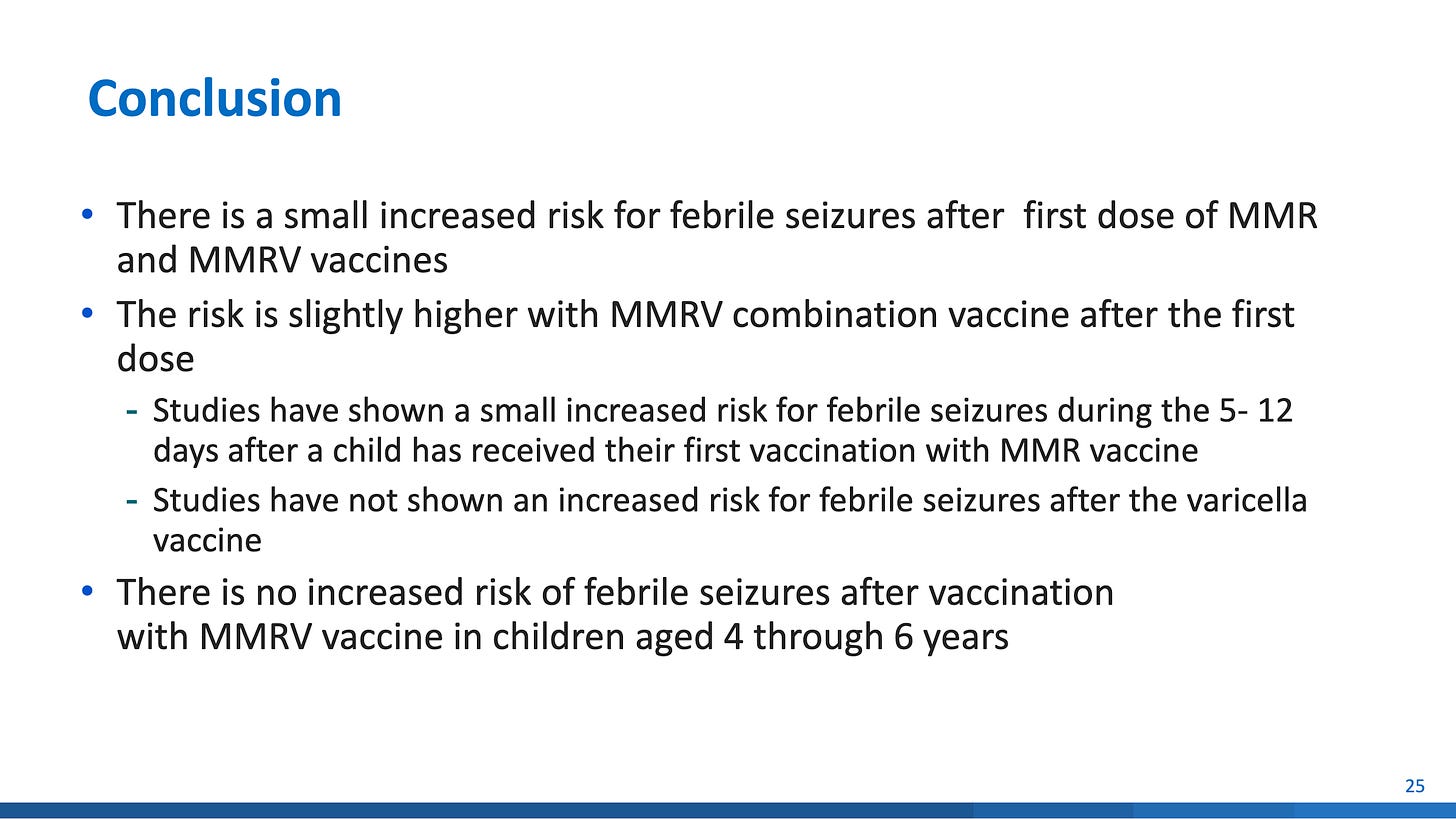 Of course you want to give a vaccine with the best safety profile for who you are giving it to. But how much is this seizure risk? I looked at the meeting materials prepared by a CDC scientist for the meeting, who shared both a rapid systematic review on safety evidence and slides in advance. There is a very, very small risk of febrile seizure for both the first doses of MMR and MMRV, but the risk is 2-fold higher for MMRV. For MMR, this means about 1 febrile seizure per 3000-4000 kids vaccinated and for MMRV this means 2 febrile seizures in the same group of kids. It’s age-dependent and there is no increased risk for the second dose. Most febrile seizures are scary, but usually resolve quickly and do not have lasting effects. They aren’t associated with long-term neurodevelopmental issues, behavior, or cognitive performance. In fact, febrile seizures occur anyway in children any time they have a fever.