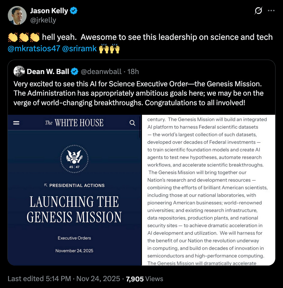 While the Genesis Mission platform will surely improve some AIxBio models (depending on their purpose), it’s hard to imagine the current administration using it to accelerate vaccine or drug development, make fundamental discoveries about biology, or make health care more accessible and efficient for Americans. The current administration loves to talk about Gold Standard Science and ending the scourge of chronic disease, but not so much about developing innovations using the scientific merit-based approach that made America the world leader in biomedical and health research. They like to cut grants instead, especially when those grants are for vaccine development. They give grants with no scientific review at all to their cronies. They enforce EOs that shut down essential laboratory research. They are misrepresenting essential research and in some cases outright lying about it. They screw around with regulatory processes to make it more difficult to approve vaccines and drugs. They are making scientific research funding contingent on ideological alignment. They want to use AI to develop alternative treatments, for the purposes of selling said alternatives and getting the government to pay for them. They are more inclined to delete government datasets than to share them.