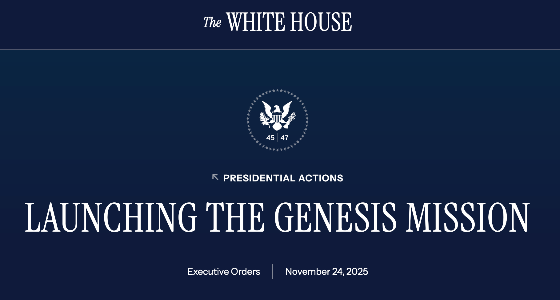The “Genesis Mission” as laid out in the EO and accompanying Fact Sheet is “a new national effort to use artificial intelligence (AI) to transform how scientific research is conducted and accelerate the speed of scientific discovery.”
