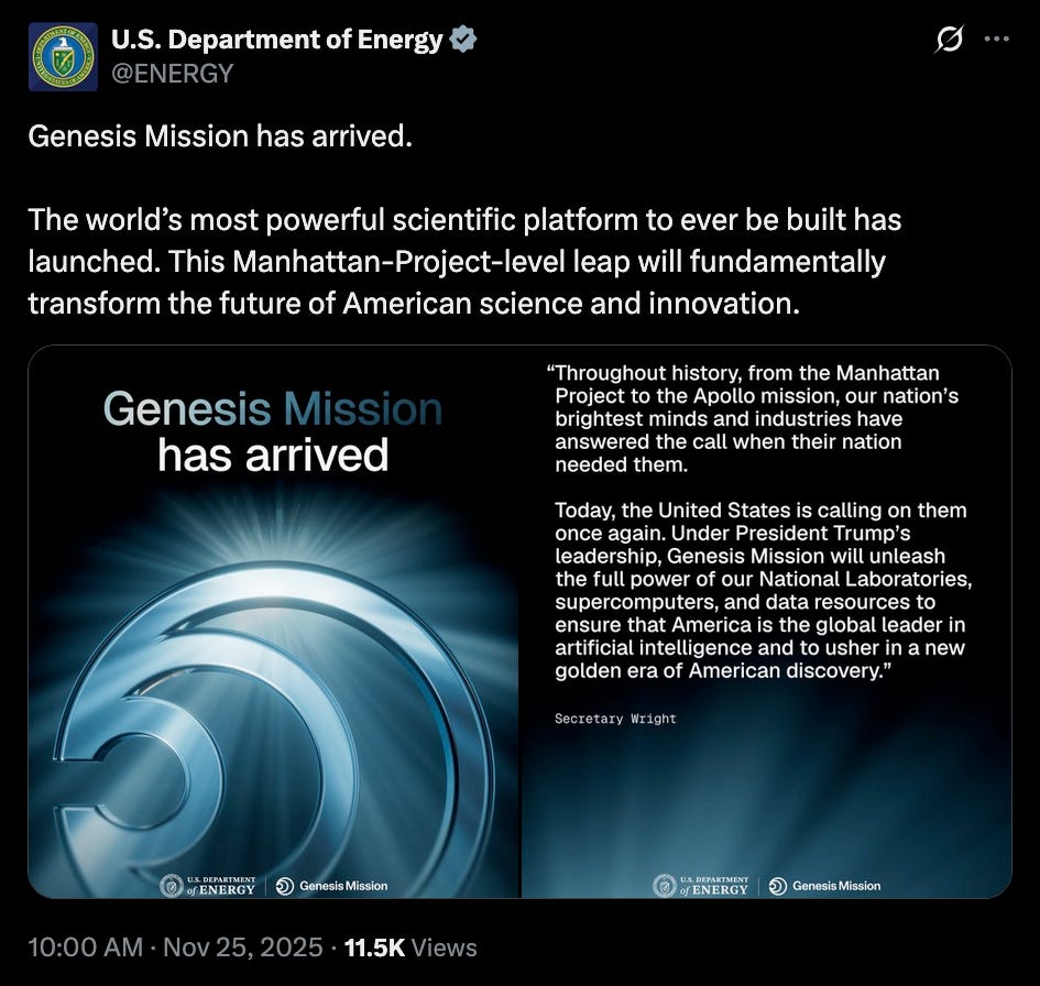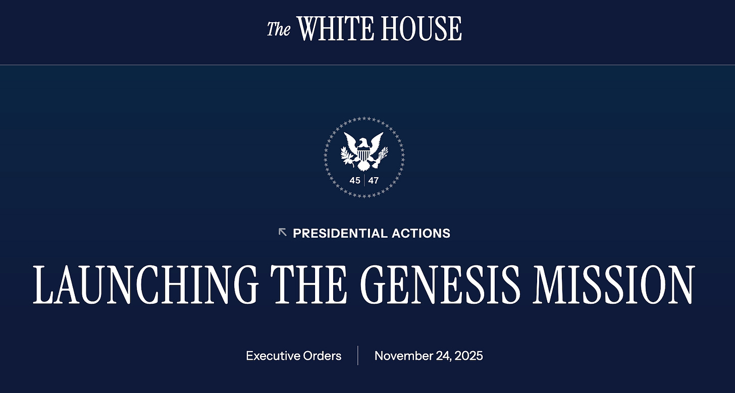 So, as soon as I saw that AIxBio Twitter was salivating over Trump’s latest Executive Order (EO), Launching the Genesis Mission, I had a bad feeling about it. Then I read the EO and screamed, because this EO is a simultaneous path to a surveillance state and supposedly possible but not remotely realistic medical innovations like—you guessed it—medbeds!