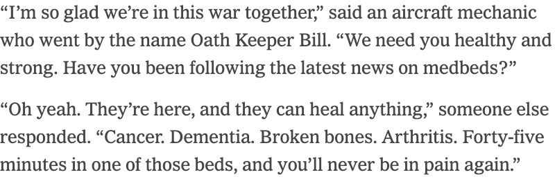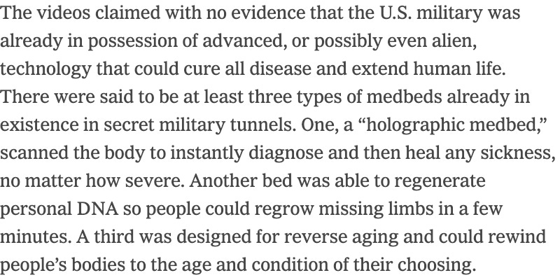 Medbeds make me very sad, because a lot of sick people in chronic pain are being exploited by terrible people who sell them a promise of an imaginary instant healing machine that doesn’t exist. As the New York Times reported in a 2024 article about the medbed phenomenon, any skepticism is met with repetitive insistence that medbeds exist that includes equal parts pseudoscience and religion. The only reason they are not yet mainstream is that they are being kept a secret by the military at the behest of woke liberal billionaires who are keeping the technology for themselves. For the people who are suffering badly enough to seek knowledge about whether medbeds might help them, resistance to the idea is gradually replaced with hope through relentless medbed disinformation.