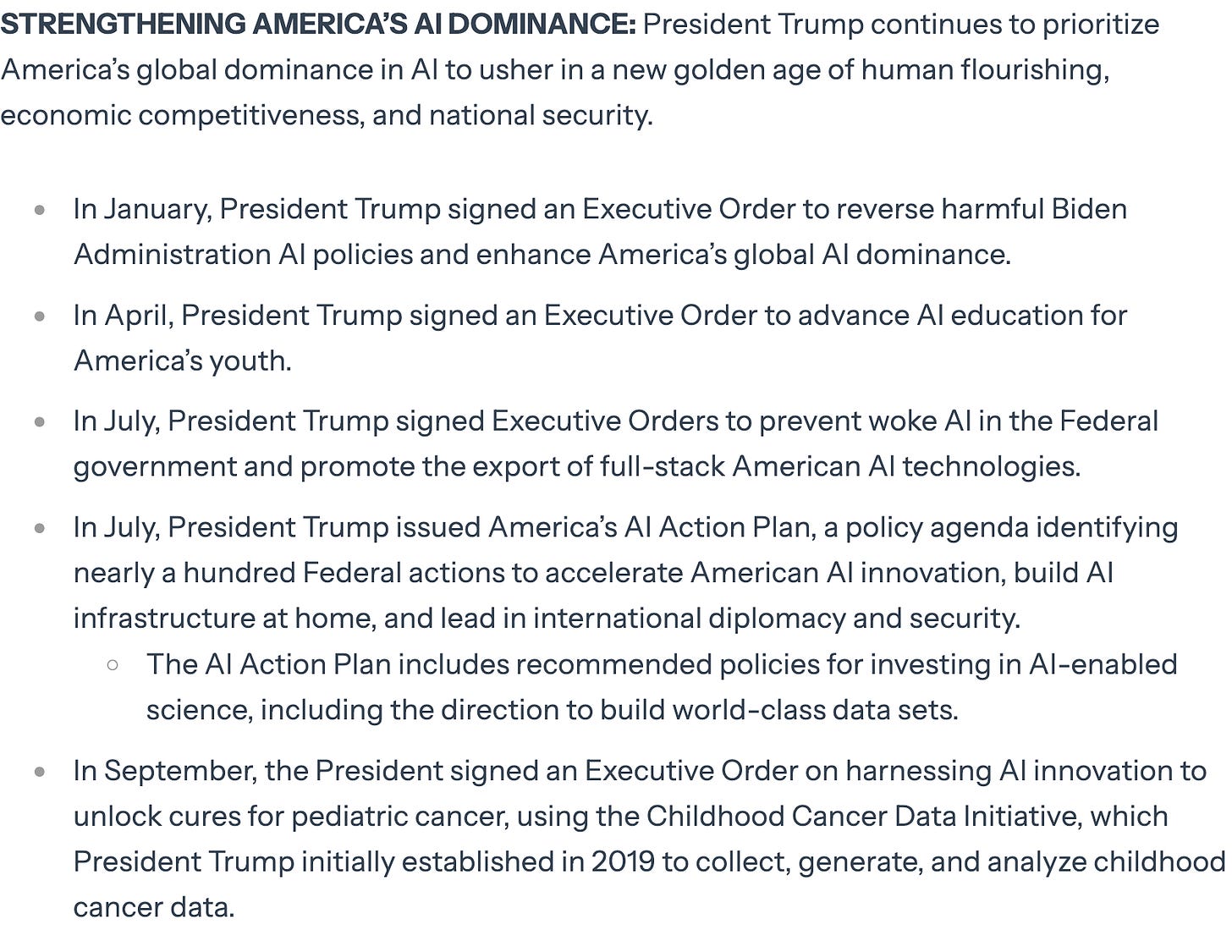 It’s true that medbeds aren’t mentioned anywhere in the Genesis Mission EO, but I can see their presence nonetheless. The EO sells a fantasy of all-powerful biomedical AI that will “usher in a new golden age of human flourishing” and can “unlock cures” for terrible diseases like pediatric cancer. As with most Trump scientific EOs, it’s light on details and heavy on grand promises that are unlikely to be kept. It fills in any blanks with grandiose claims about AI dominance, citing only “DOE training sets and high-performance computing resources” and “robotics” as the means to achieve it. The Fact Sheet brags about the Trump administration’s steps toward AI dominance so far, which is primarily issuing other EOs and Action Plans asserting that said dominance has already been achieved.