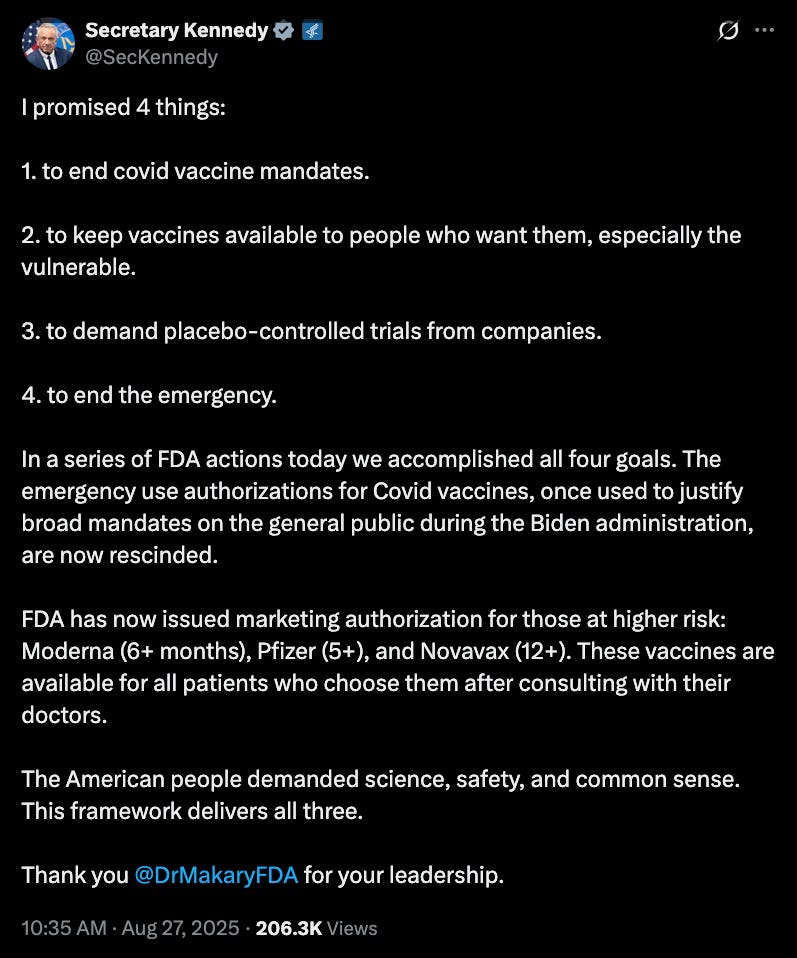 Many people (self included) had been very concerned that COVID-19 vaccines would be kept off the US market this fall due to inaction on the part of the FDA. US Health and Human Services Secretary Robert F. Kennedy, Jr. has used an assortment of bureaucratic tactics to disrupt vaccine access across the US, so I expected that he might just instruct FDA Commissioner Marty Makary to block licensing applications for the updated COVID-19 boosters.