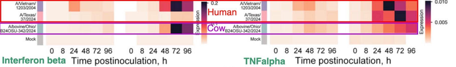 Not much has been done so far to look at the capacity of clade 2.3.4.4.b H5N1 to evade the innate antiviral response, although my colleagues at NIAID did a nice study comparing two clade 2.3.4.4.b cow viruses (one isolated from a human dairy worker in Texas, one from an infected cow in Ohio) to a historical, highly lethal bird-derived H5N1 from an outbreak in 2004 (H5N1/Vietnam/12/03/2004 or Vn1203 for short). They looked at ISG expression in two different types of human lung organoids (iPSC-derived vs adult stem cell-derived). Organoids are basically lumps of differentiated epithelial cells that approximate some features of an actual lung and are more lung-like than just some undifferentiated epithelial cells on a plate.