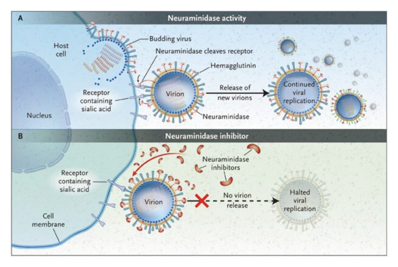 One of the only two classes of drugs for treating flu, NA inhibitors (like oseltamivir/TamiFlu) blocks this interaction. If the virus particles can’t leave their host cell, the infection can’t spread. Unfortunately, resistance mutations can arise in the virus pretty easily that render NA inhibitors fairly useless.