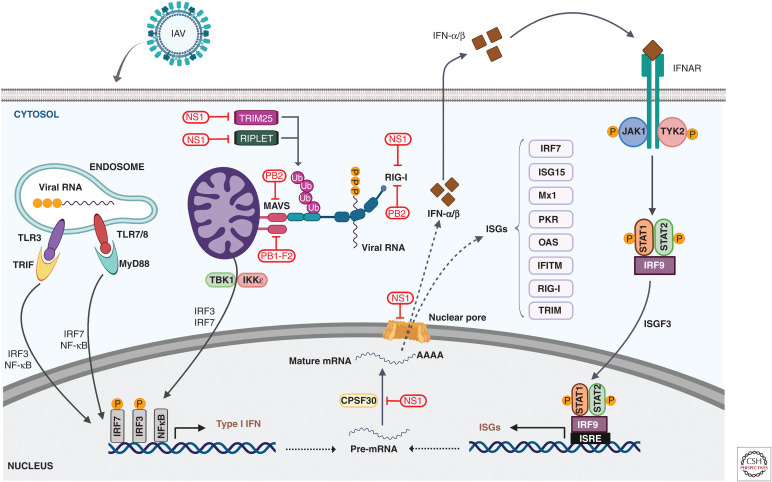 Viral infections trigger “sensors” in cells that turn on the interferon pathway. This results in interferon being made, which is a cytokine (signaling molecule) that effectively announces to all nearby cells that there’s a virus around and start expressing interferon-stimulated genes (ISGs). ISGs do various things, including regulating inflammation, directing different immune cells where to go and what to do, turning on adaptive immune responses, and directly targeting the virus or steps in its replication cycle. ISGs have a profound impact on proinflammatory cytokines, which are messengers that amp up inflammation. Proinflammatory cytokines are crucial for clearing virus infections, but if they are not kept in check, they lead to widespread disease pathology.