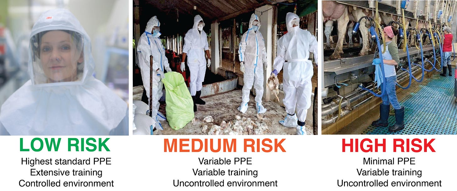 Right now, exposure risk is limited to people who have contact with birds, cows, or other infected animals. For H5N1 to become a pandemic virus, humans would need to become an exposure risk themselves. The virus must acquire the ability to spread from person to person by the respiratory route, which means it must adapt to grow and shed in the cells of the upper respiratory tract. The more humans the virus infects, the more opportunities it gets to adapt. We need to stop humans from getting infected now by reducing their exposure risk. This can be done by using PPE such as respirators in high-risk environments like dairy or poultry farms, shoring up biosecurity practices to prevent virus from coming and going off an infected farm, altering work practices when possible to reduce splashing and creating aerosols, training workers, incentivizing reporting, and quarantine and isolation for people who do get exposed or infected.