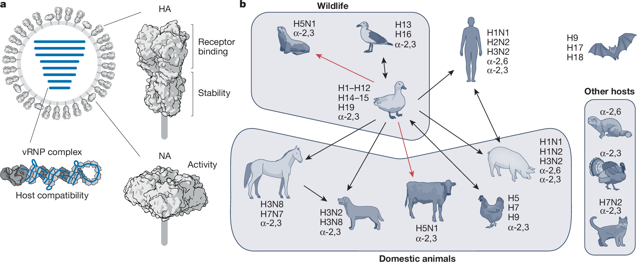 The ability of a virus to infect a cell depends on its ability to get inside the cell, which is determined by the ability of the viral envelope glycoproteins to interact with its entry receptor. Virologists call the ability to infect a cell susceptibility. Enveloped viruses like influenza have a membrane around the virus particle with viral proteins embedded in it. The spike protein of SARS-CoV-2 is an example of an envelope glycoprotein. Influenza viruses have 2 glycoproteins, hemagglutinin (HA) and neuraminidase (NA). These are the H and N in H5N1. HA primarily determines entry and it binds a sugar molecule called sialic acid that is bound to another sugar called galactose that “decorates” host proteins. HA binds sialic acid and unlocks the cell for the virus to enter it.