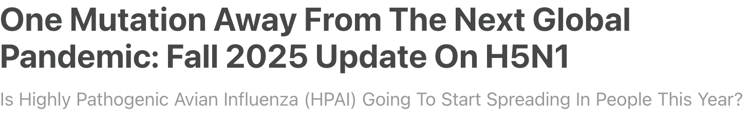I gave a talk a couple months back about how the reorganization of the US government and its new pro-virus approach to public health will leave us hopelessly unprepared and vulnerable if H5N1 gains the ability to spread between humans. In August, H5N1 outbreaks hadn’t started ticking back up. Now they are exploding.