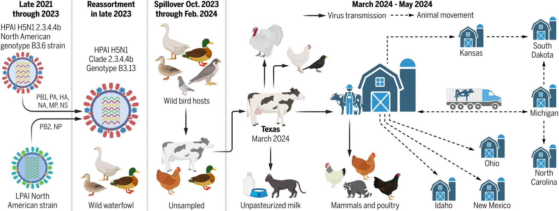 The dairy cow outbreak caused by a novel reassortant genotype B3.13 H5N1 virus that clearly has the ability to replicate efficiently and shed from bovine mammary tissue, but it never would have spread so widely if circumstances didn’t facilitate it. A single introduction of this virus into cows caused the huge outbreak, which has now infected more than a thousand herds, spilled back to other species, and infected a bunch of human dairy workers. That spread likely occurred through conditions specific to the dairy industry: lots of cows on farms, biosecurity and surveillance practices that didn’t account for influenza virus because we didn’t think bird flu was very good at infecting cows, and frequent interstate transport of lactating cows. We weren’t expecting it, so we didn’t know the risks that needed to be mitigated. We didn’t mitigate them.