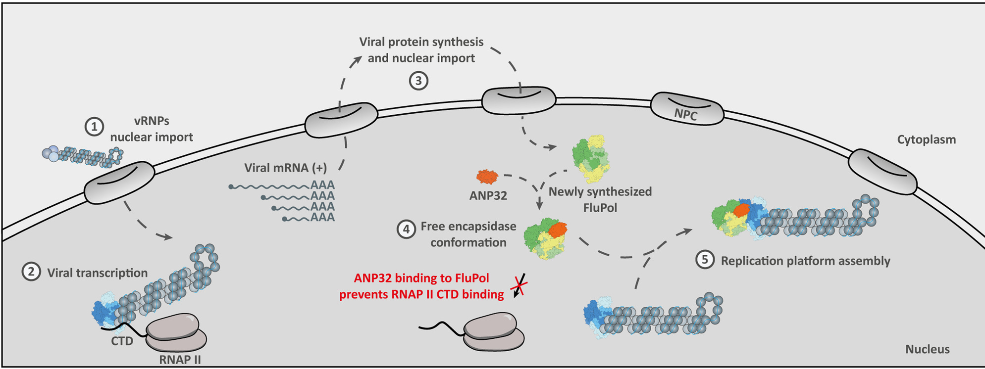 In order to replicate, H5N1 has to do two things: make viral RNA and make viral proteins. H5N1 specifically has to make the protein subunits of the viral polymerase (enzyme that copies RNA) that can assemble into a complex to copy the viral gene segments. Complex formation requires a host protein called ANP32. If ANP32 can’t bind the viral polymerase, replication won’t occur.